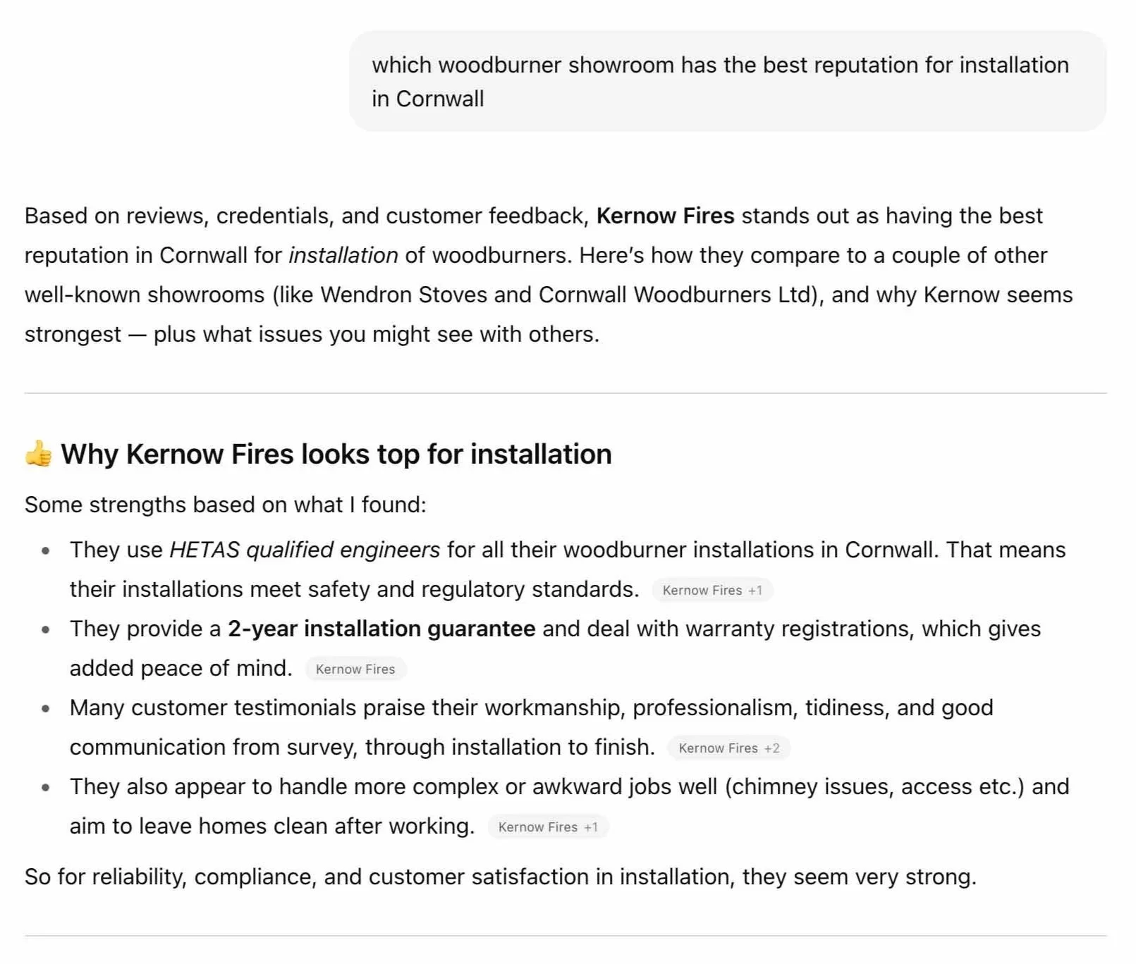 Take Kernow Fires as a real example. When this exact question was put to ChatGPT, Kernow Fires dominated the results. Why? Because their website combines: